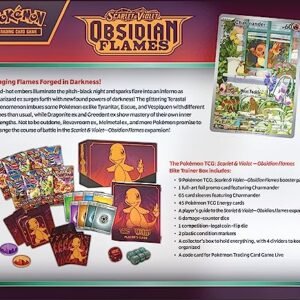 • The Pokémon TCG: Scarlet & Violet—Obsidian Flames Elite Trainer Box includes 9 Pokémon TCG: Scarlet & Violet—Obsidian Flames booster packs and 1 full-art foil promo card featuring Charmander.