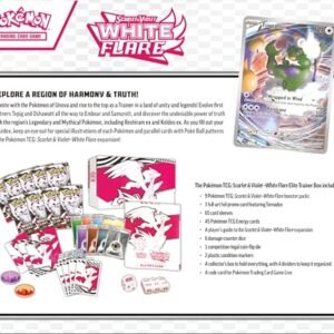 • The Pokémon TCG: Scarlet & Violet—White Flare Elite Trainer Box includes 9 Pokémon TCG: Scarlet & Violet—White Flare booster packs and 1 full-art foil promo card featuring Tornadus.